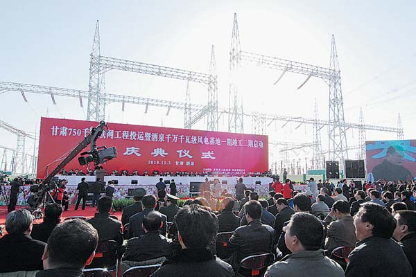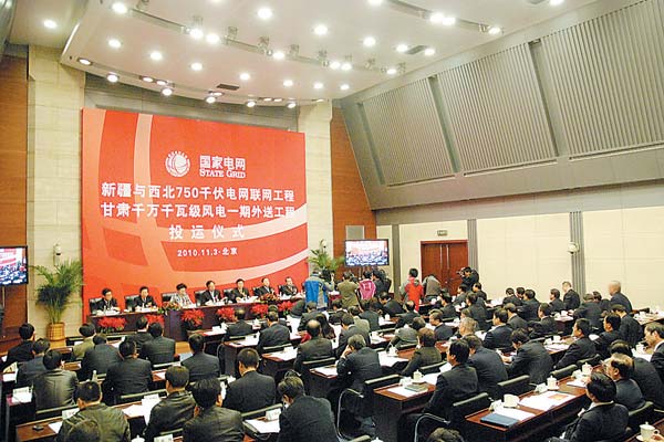 11月3日,在京举行的新疆与西北750千伏电网联网工程暨甘肃千万千瓦级风电一期外送工程投运仪式。
