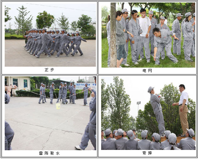 中复连众军事训练在传统军训内容的基础上,还融入了背摔、电网、雷阵取水、盲阵等拓展训练的项目。这些拓展项目一方面丰富了军训贫乏、单调的内容,另一方面加深了新员工之间的相互了解,增强他们的团队精神和合作意识,通过复杂而艰巨的拓展项目,员工们之信任、理解、默契与日俱增,这为他们以后出色的完成工作任务打下了坚实的基础。