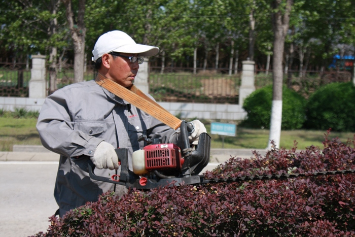 此时年近六旬的王昌岭师傅正在给花木浇水,王师傅是园林绿化养护师,主要负责厂区内花木的养护工作。因为厂区取水点少,公司大面积的绿化区域要靠人工安装水管浇水,有些偏远处水管接触不到的只有通过水桶拎水,这在时间上花费就比较长,无形当中也增加了工作量,王师傅不急不缓的做着自己的工作。为了减轻师傅们的工作量,公司还多次组织员工在园区内进行除草、浇水活动。