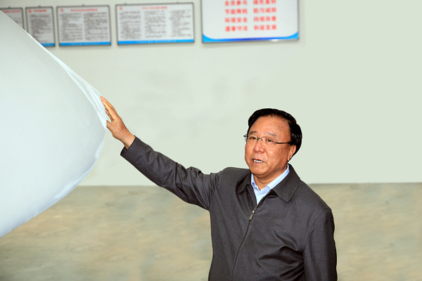 随后,陆浩、徐守盛等各位领导和嘉宾相继视察了包括中复、华锐、金风科技的几个酒泉产业化基地的风电企业。在来到中国复材3兆瓦的叶片车间之后,陆浩认真听取了张定金的介绍汇报,当看到中复生产的3兆瓦叶片时非常高兴,并与其他领导和嘉宾一起出席中复3.0MW风力机叶片的投产仪式,中国复材副总经理、中复连众集团董事长任桂芳、总经理乔光辉陪同参观。