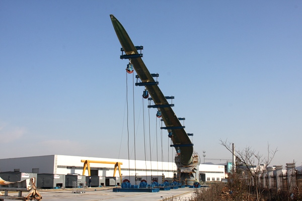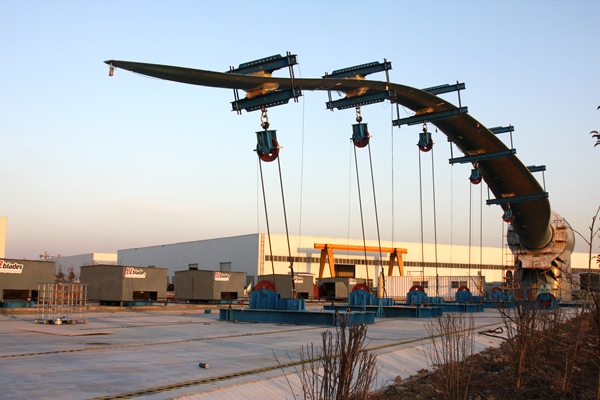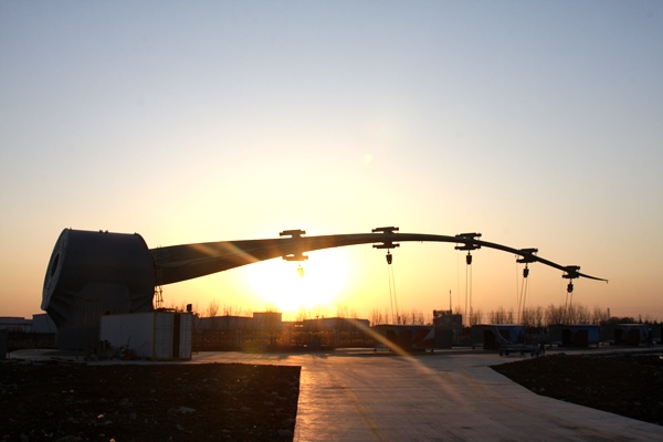 11月30日,中复连众10兆瓦试验台正式启用,顺利完成首只62米、5兆瓦风机叶片静力试验。