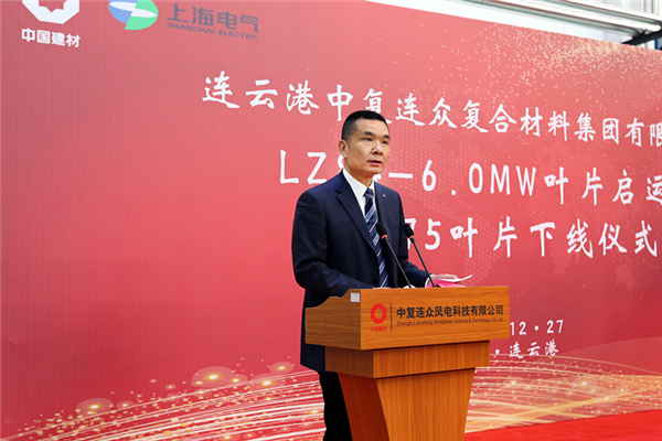 2018年12月27日,中复连众集团在连云港举行LZ84-6.0MW叶片启运暨B75叶片下线仪式。中国建材集团副董事长李新华,连云港市人民政府副市长徐家保,上海电气风电集团总裁谢雪琼,中国复材集团党委书记、董事长、总经理刘标,连云港经济技术开发区党工委副书记、常务副主任胡传宏共同启动水晶球,见证这一历史时刻。