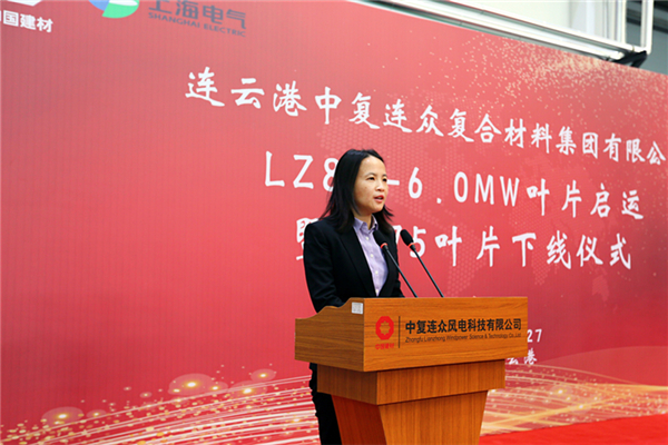 中复连众集团党委书记、总经理乔光辉、上海电气风电集团总裁谢雪琼分别代表合作双方致辞,中国复材集团党委书记、董事长、总经理刘标,连云港经济技术开发区党工委副书记、常务副主任胡传宏对LZ84-6.0MW叶片启运和B75叶片的成功下线表示祝贺。中复连众集团副总经理、中复连众风电科技有限公司总经理梁颖主持仪式。中国建材集团科技部总经理郅晓、业主代表、西门子技术团队及中复连众集团中层以上干部、中复连众风电科技有限公司员工代表出席仪式。