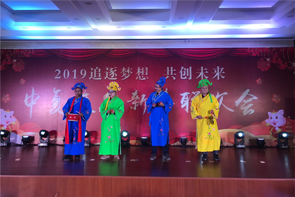 2019年注定是不平凡的一年,今年是新中国成立70周年,也是中复连众成立30周年,企管部的杨映伟、王建、王秋、车凯表演的三句半《回顾2018》和国际部的王彬苏、卢保国带来的朗诵《筑梦路上勇者无惧》回顾了2018年祖国热点事件和公司大事记,公司副总经理王彤兵带领他的“十年团队”演唱的歌曲《东方之珠》,从老员工的视角表达了对公司的浓厚情感。
