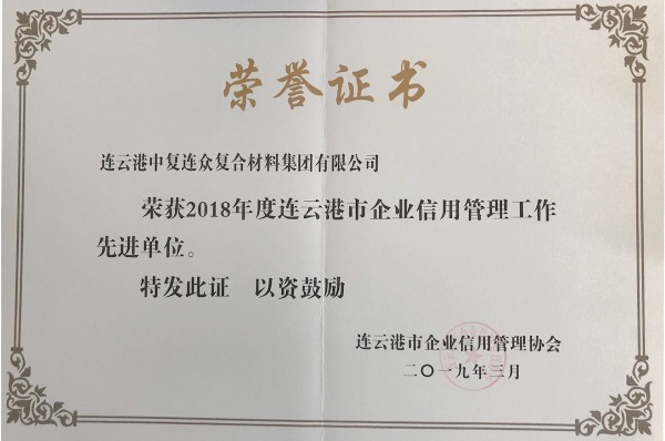 3月21日,连云港市企业信用管理协会对荣获2018年度市级“信用管理先进单位”进行表彰并举行授牌仪式,中复连众榜上有名。