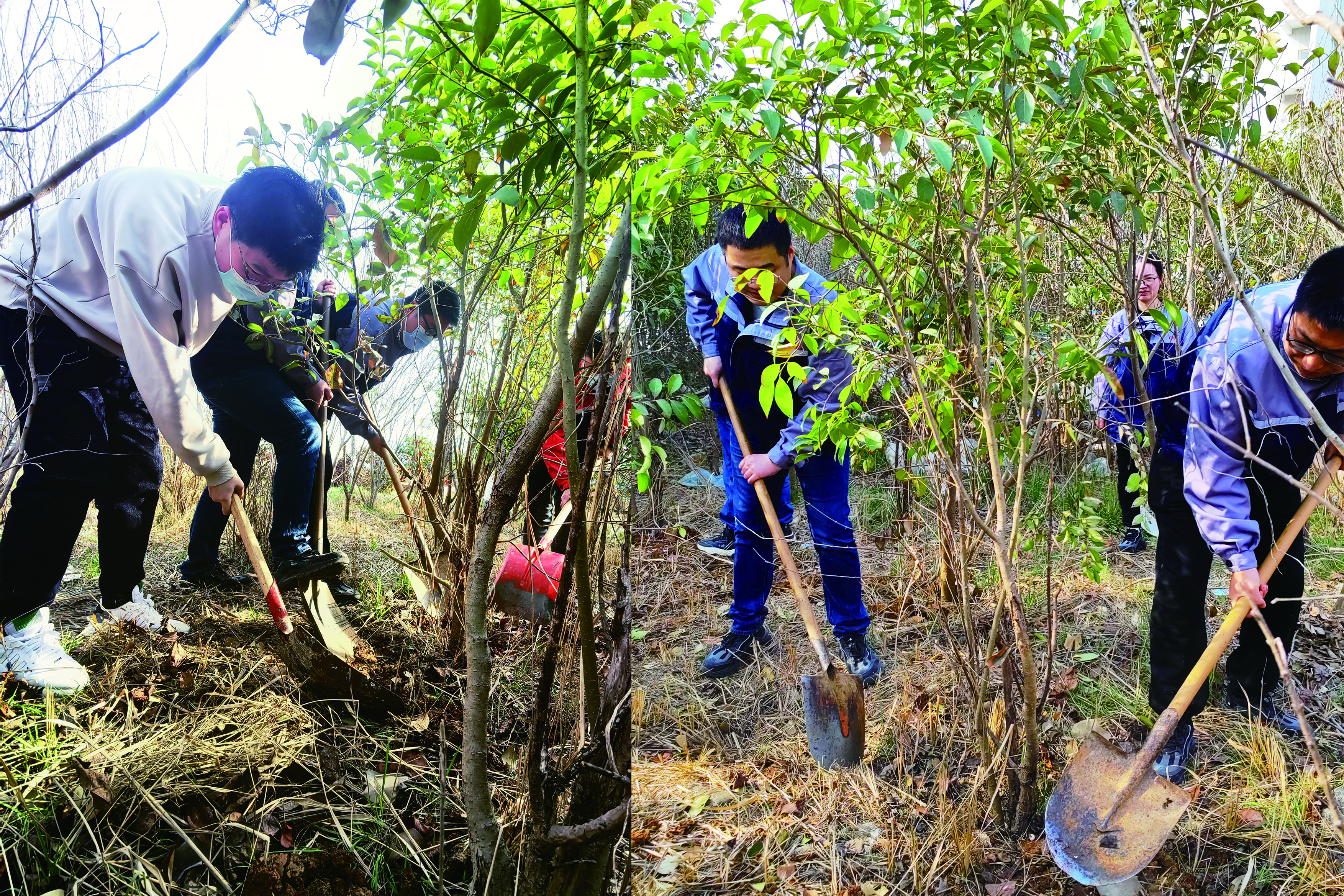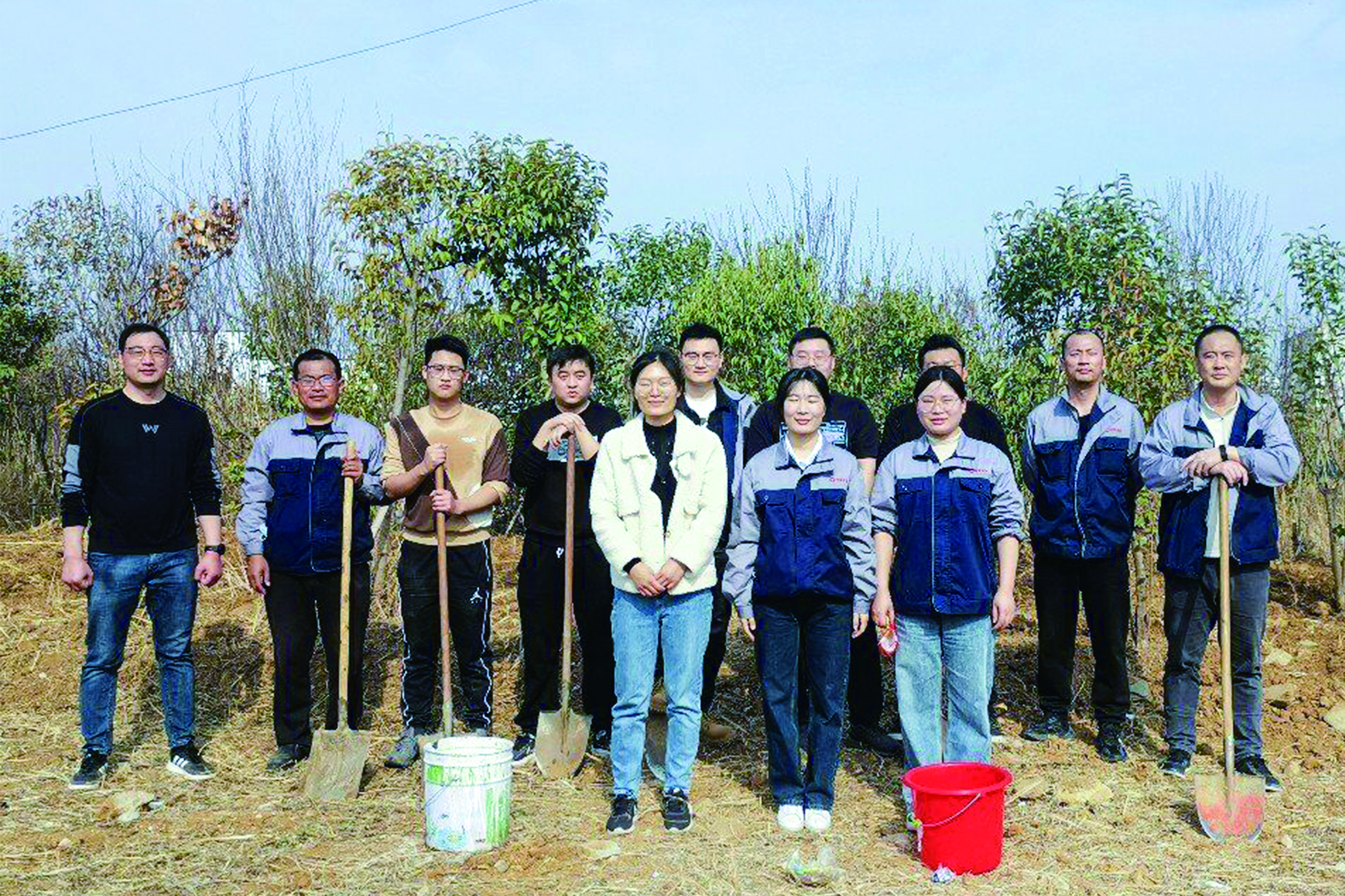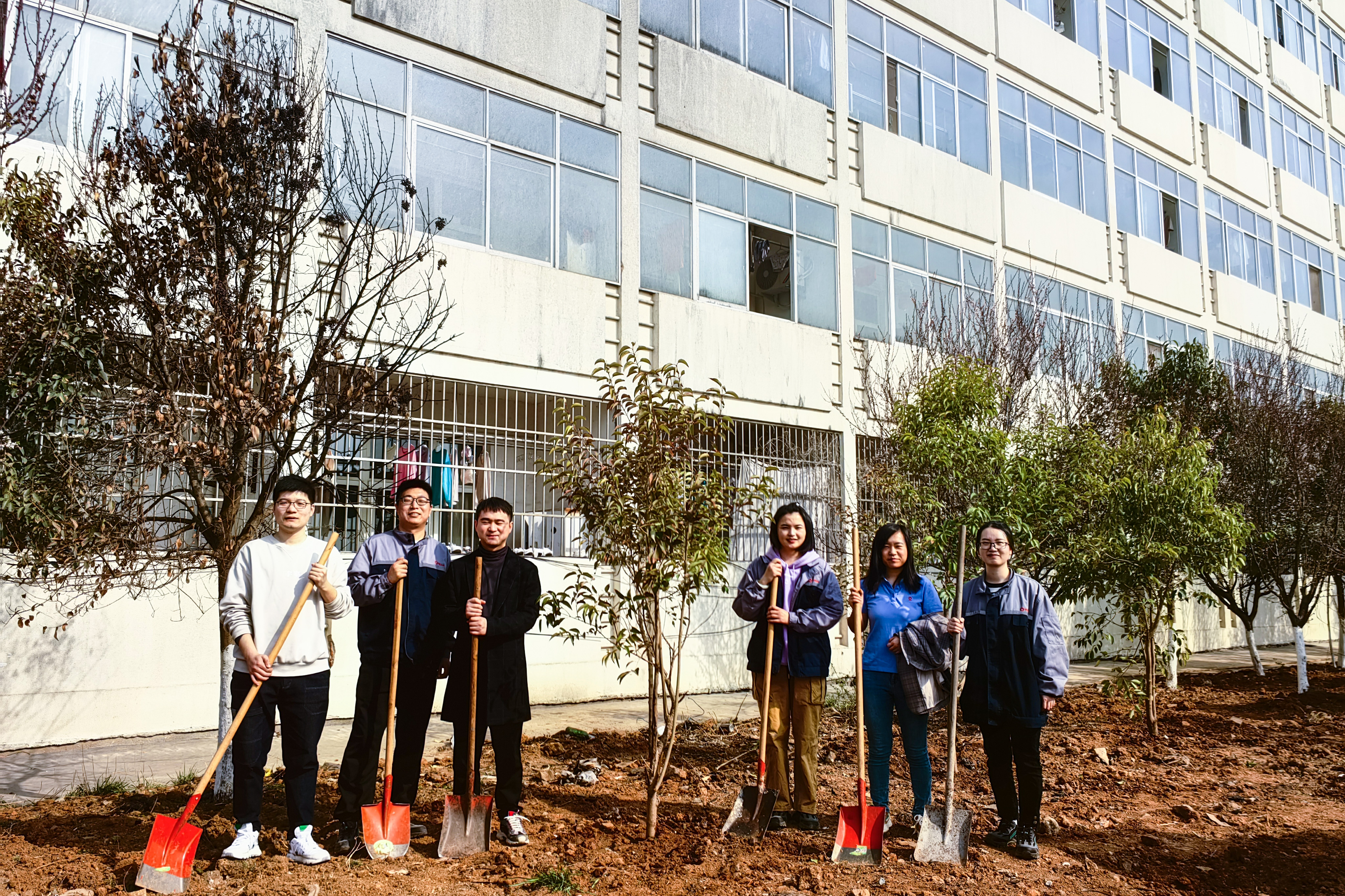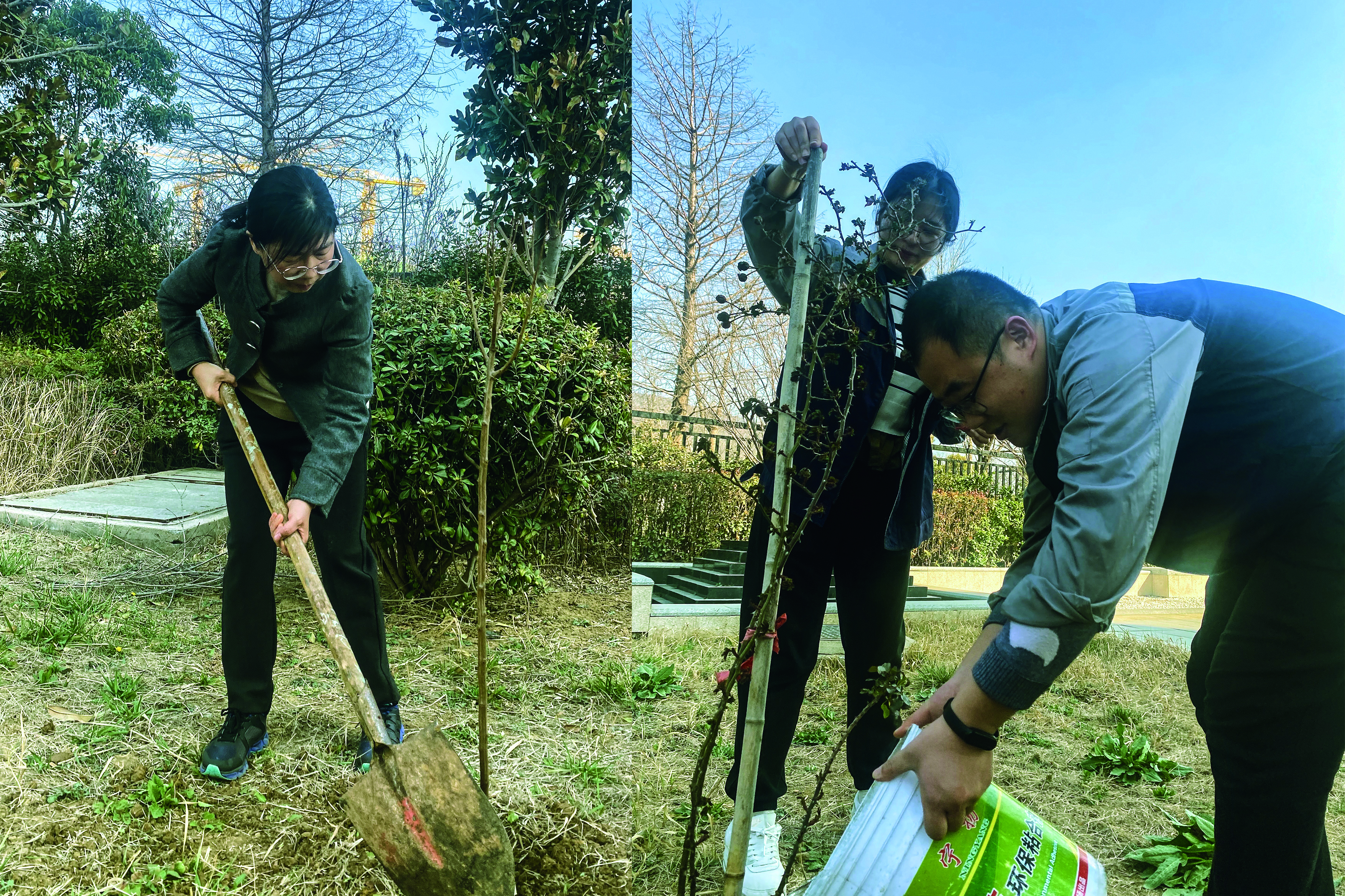 活动分别设在科研楼和连云港叶片工厂大浦工厂,科研楼现场主要是栽新苗增绿,大浦工厂现场主要是移苗护绿。在栽苗现场,大家手持铁铲、分工协作,有的挥铲掘坑、有的扶苗校正、有的培土围堰、有的提水浇灌……每个环节都井然有序,每道工序都认真细致、一丝不苟,确保栽一棵活一棵。在挖苗现场,大家在保护好树苗根部的前提下将树苗挖起,并借助工具车将树苗移至新地栽种,集中力量对移植的树木做好浇水定根工作,确保移一棵活一棵。本次活动大家相继种下了大叶女贞、山楂、蔷薇、月季等20余棵不同种类的苗木,青翠的树苗在明媚的阳光中迎风而立,展现出盎然生机和蓬勃活力。
